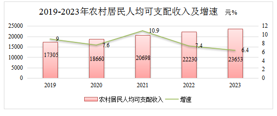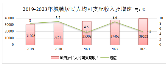 全年城镇居民人均可支配收入39298元,增长4.9%;农村居民人均可支配收入23653元,增长6.4%。城镇居民人均消费支出28201元,增长4.3%;农村居民人均消费支出18027元,增长6.2%。