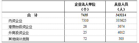 在工业企业法人单位中,内资企业7310个,占98.3%;港澳台投资企业28个,占0.4%;外商投资企业25个,占0.3%。