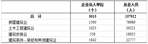 2023年末,全市共有建筑业企业法人单位[3]5015个,比2018年末增长76.5%;从业人员157912人,比2018年末下降7.4%。