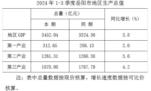 根据地区生产总值统一核算结果,2024年1-3季度岳阳市地区生产总值3452.04亿元,按可比价格计算,同比增长3.8%。分产业看,第一产业增加值312.65亿元,增长2.0%;第二产业增加值1261.31亿元,增长3.6%;第三产业增加值1878.08亿元,增长4.2%。