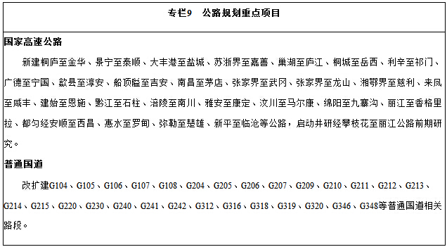 (二)优化公路运输网络。积极推进国家高速公路建设。以上海至成都、上海至重庆、上海至昆明、杭州至瑞丽等国家高速公路为重点,统筹推进高速公路建设,消除省际间“断头路”,尽快形成连通20万人口以上城市、地级行政中心、重点经济区、主要港口和重要边境口岸的高速公路网络。在科学论证和规划基础上,建设必要的地方高速公路,作为国家高速公路网的延伸和补充。