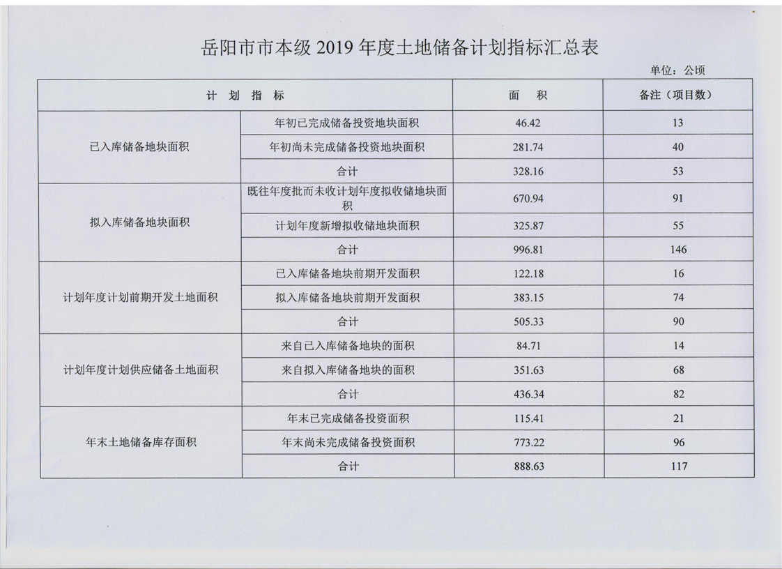 岳阳市市本级2019年度土地储备计划指标汇总表