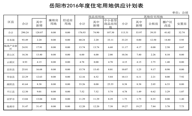 岳阳市2016年度住宅用地供应计划表
