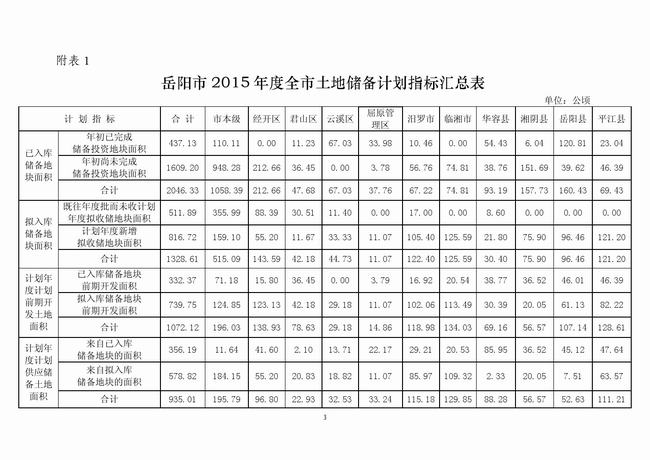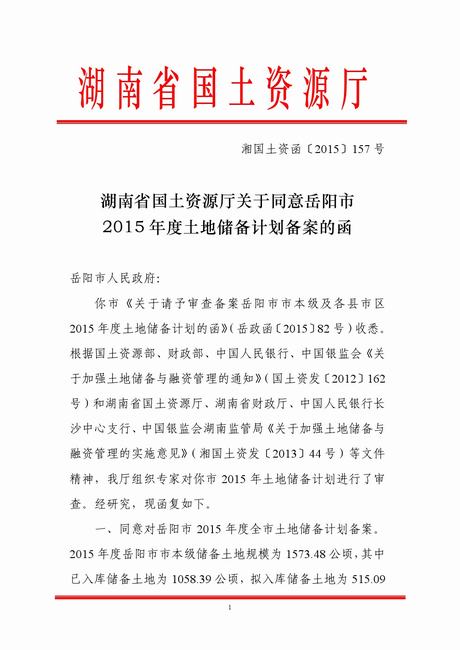 湖南省国土资源厅关于同意岳阳市2015年度土地储备计划备案的函