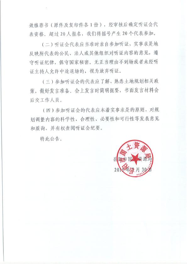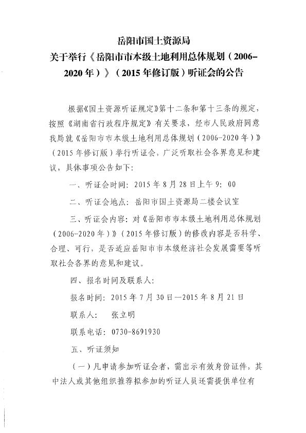 岳阳市国土资源局关于举行《岳阳市市本级土地利用总体规划(2006-2020年)》(2015年修订版)听证会的公告
