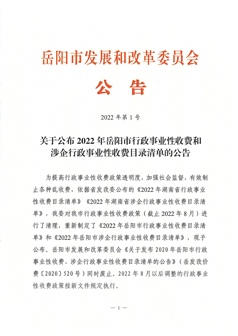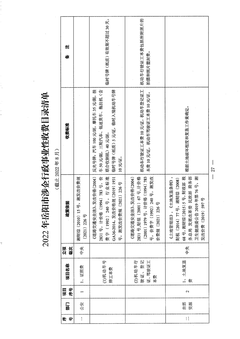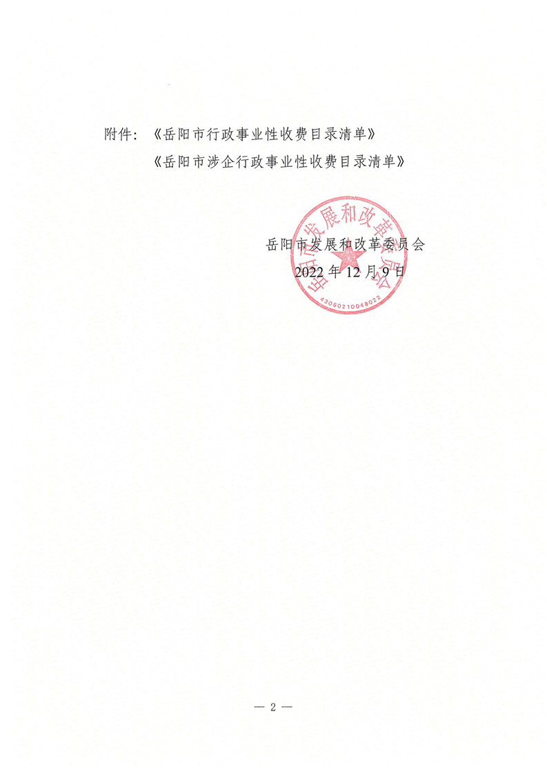 2022年岳阳市行政事业性收费和涉企行政事业性收费目录清单