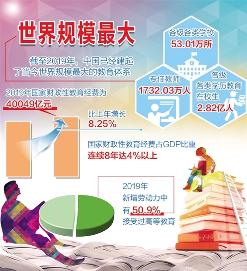 “十三五”时期,我国开启加快教育现代化、建设教育强国的历史新征程,教育事业取得了举世瞩目的成就。截至2019年,全国共有各级各类学校53.01万所,各级各类学历教育在校生2.82亿人,专任教师1732.03万人,中国已经建起了当今世界规模最大的教育体系。
