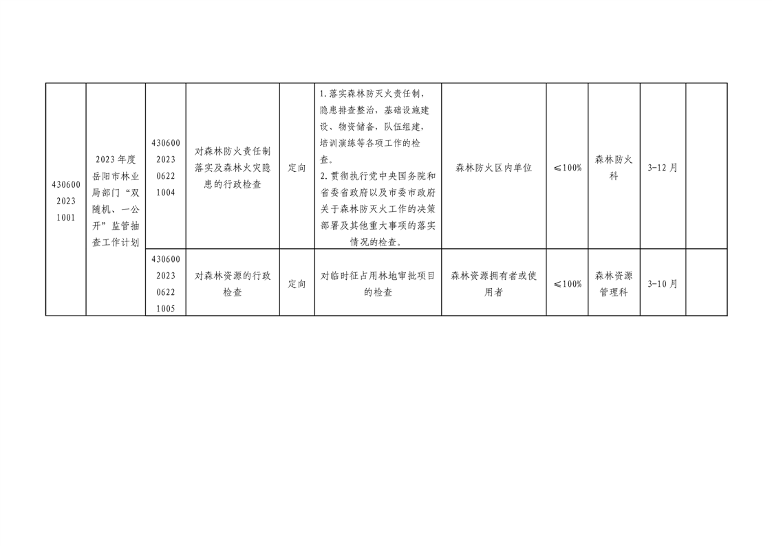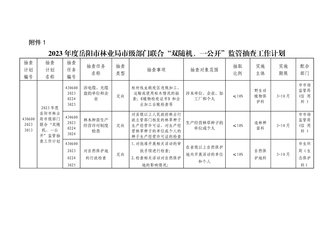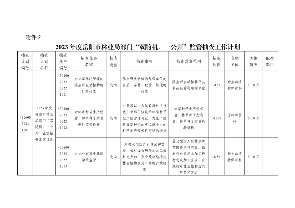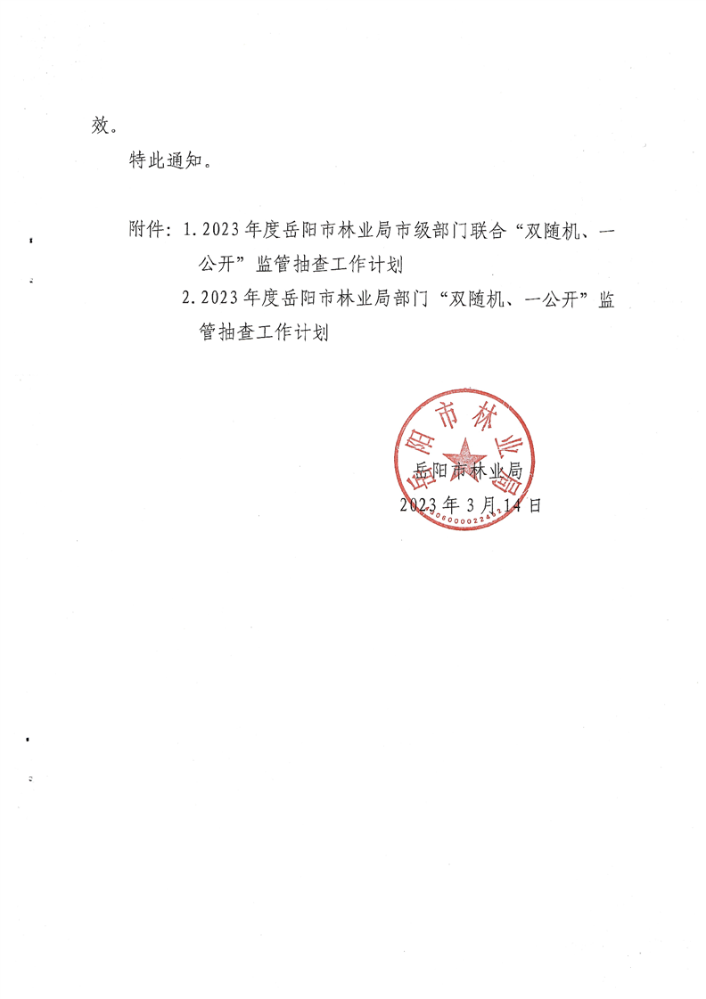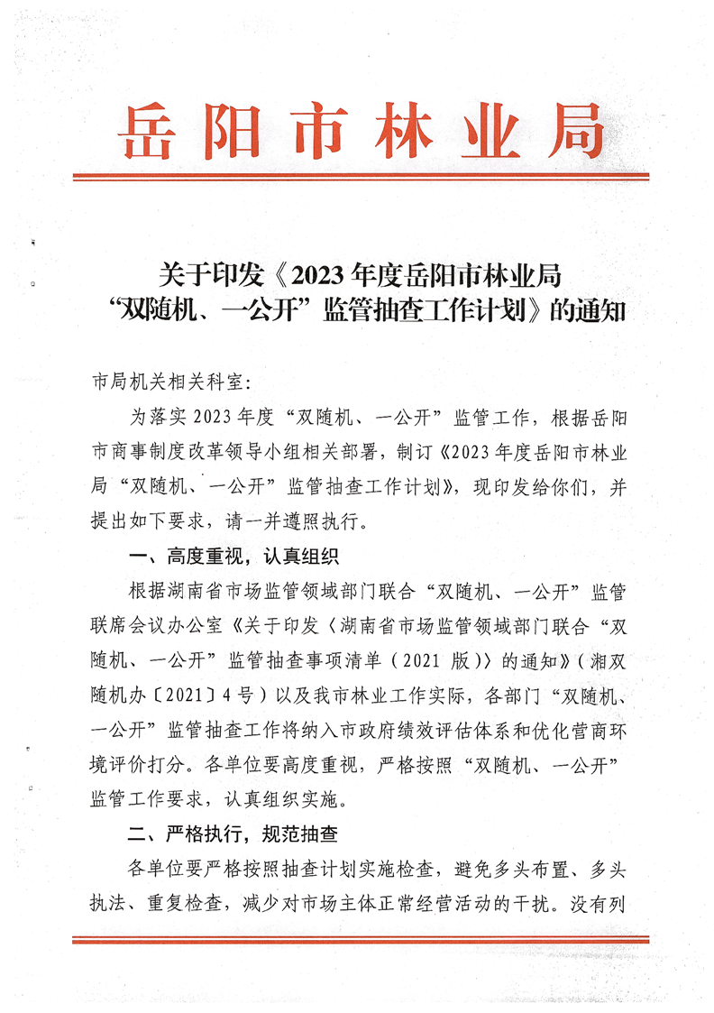 岳阳市林业局关于印发《2023年度岳阳市林业局“双随机、一公开”监管抽查工作计划》的通知