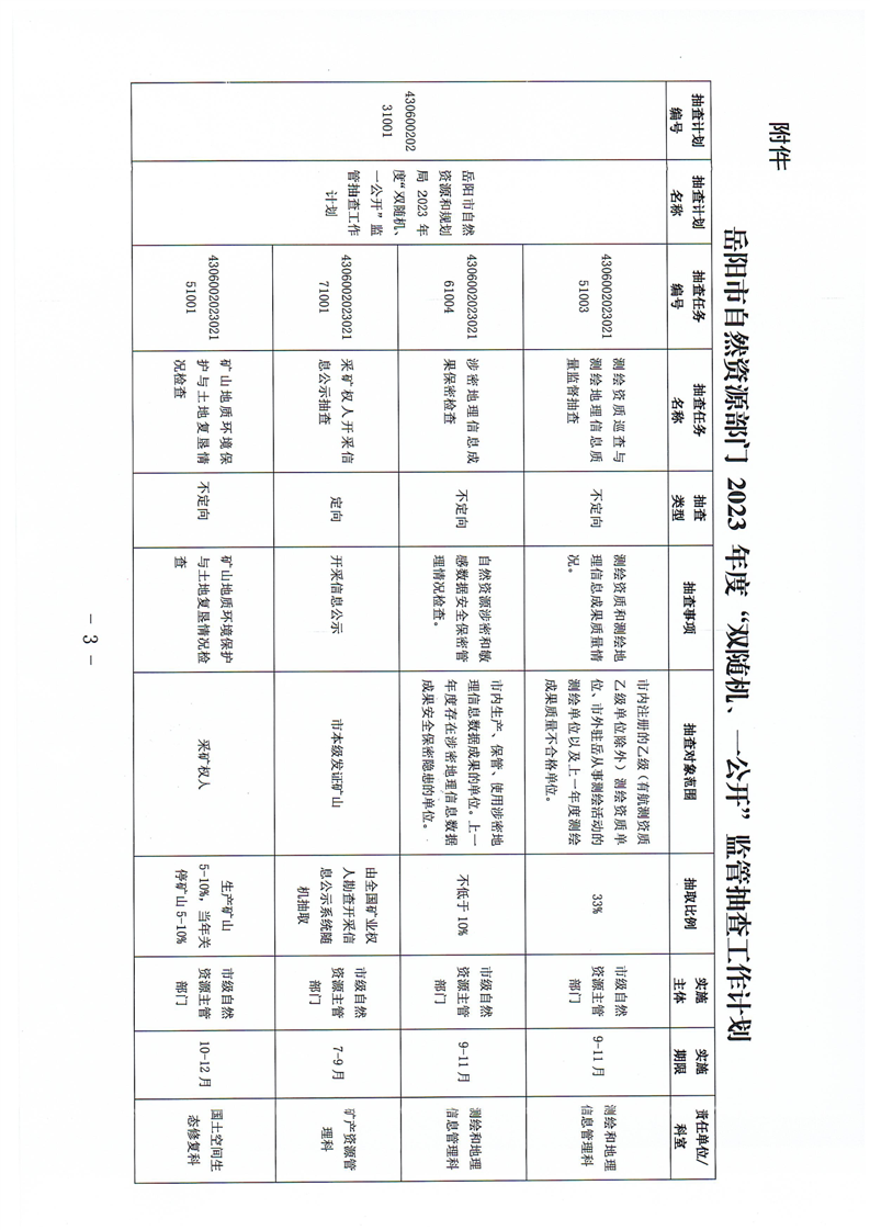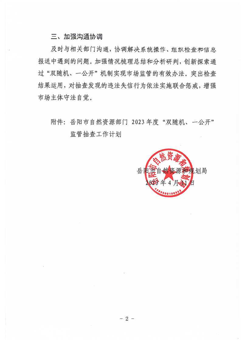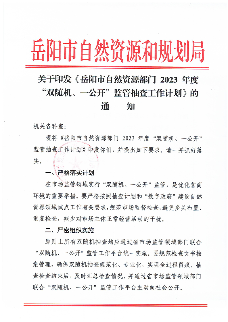 关于印发《岳阳市自然资源部门2023年度“双随机、一公开”监管抽查工作计划》的通知