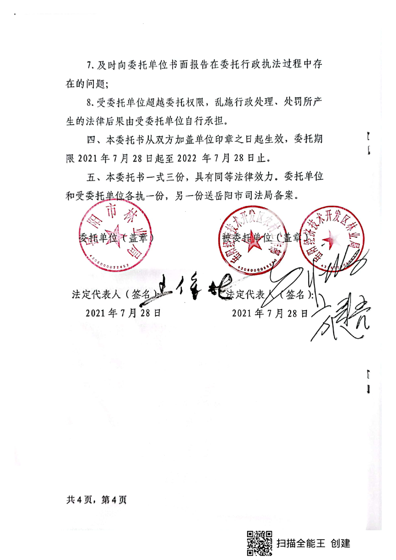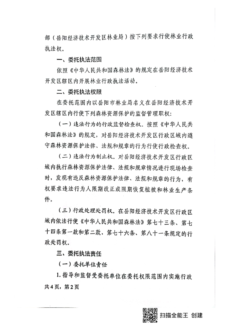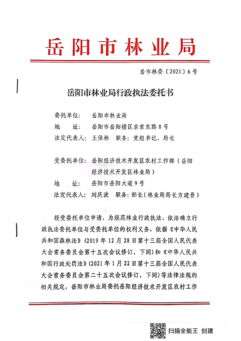 岳阳市林业局关于经济技术开发区的行政执法委托书