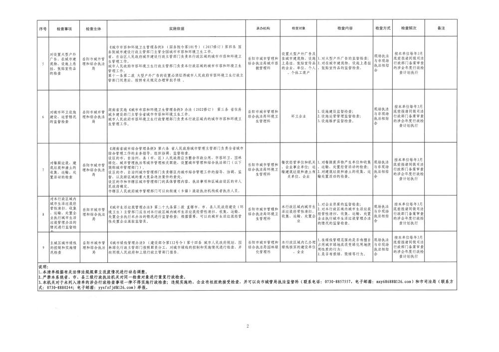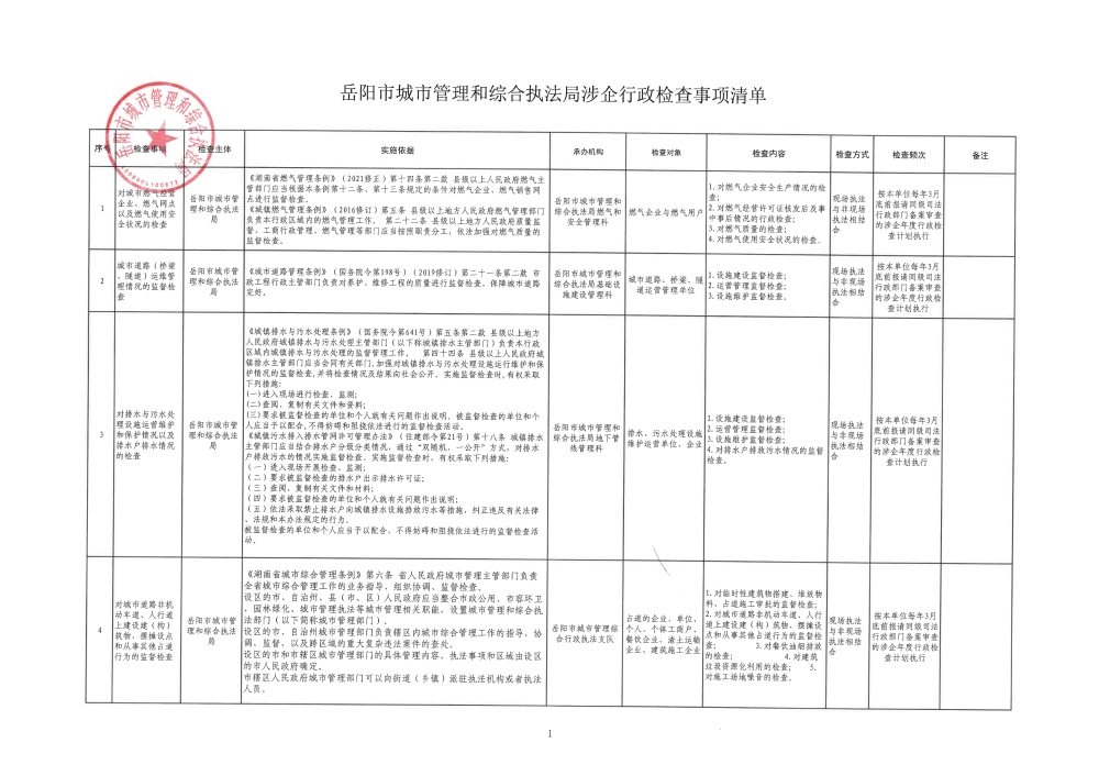 岳阳市城市管理和综合执法局涉企行政检查事项清单