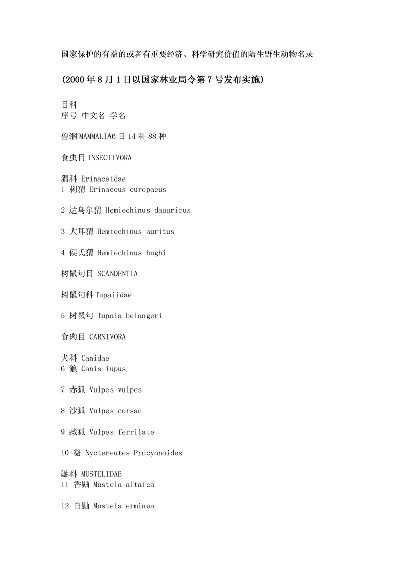 国家保护的有益的或者有重要经济科学研究价值的陆生野生动物名录