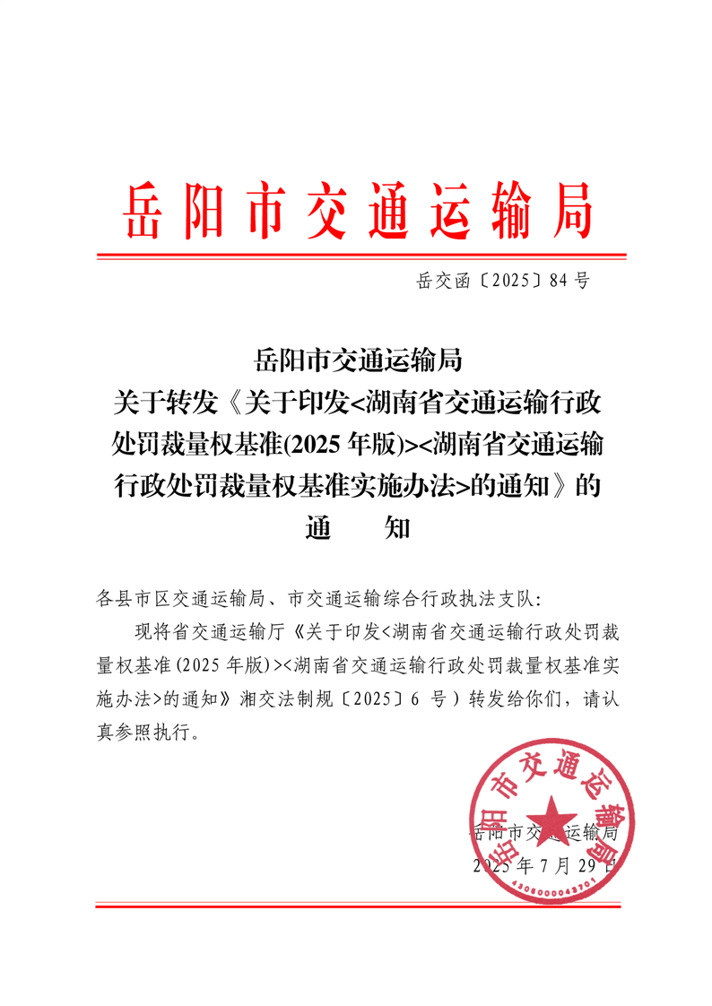岳阳市交通运输局 关于转发《关于印发湖南省交通运输行政 处罚裁量权基准(2025 年版)湖南省交通运输 行政处罚裁量权基准实施办法的通知》的通知