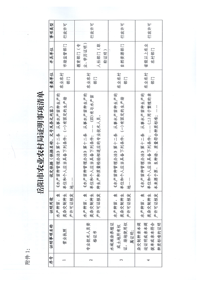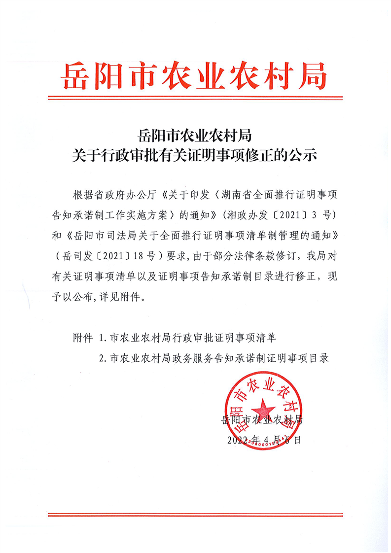 岳阳市农业农村局关于行政审批有关证明事项修正的公示