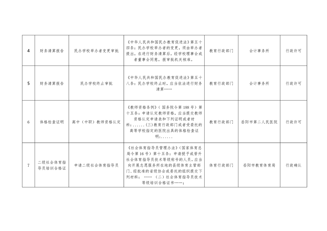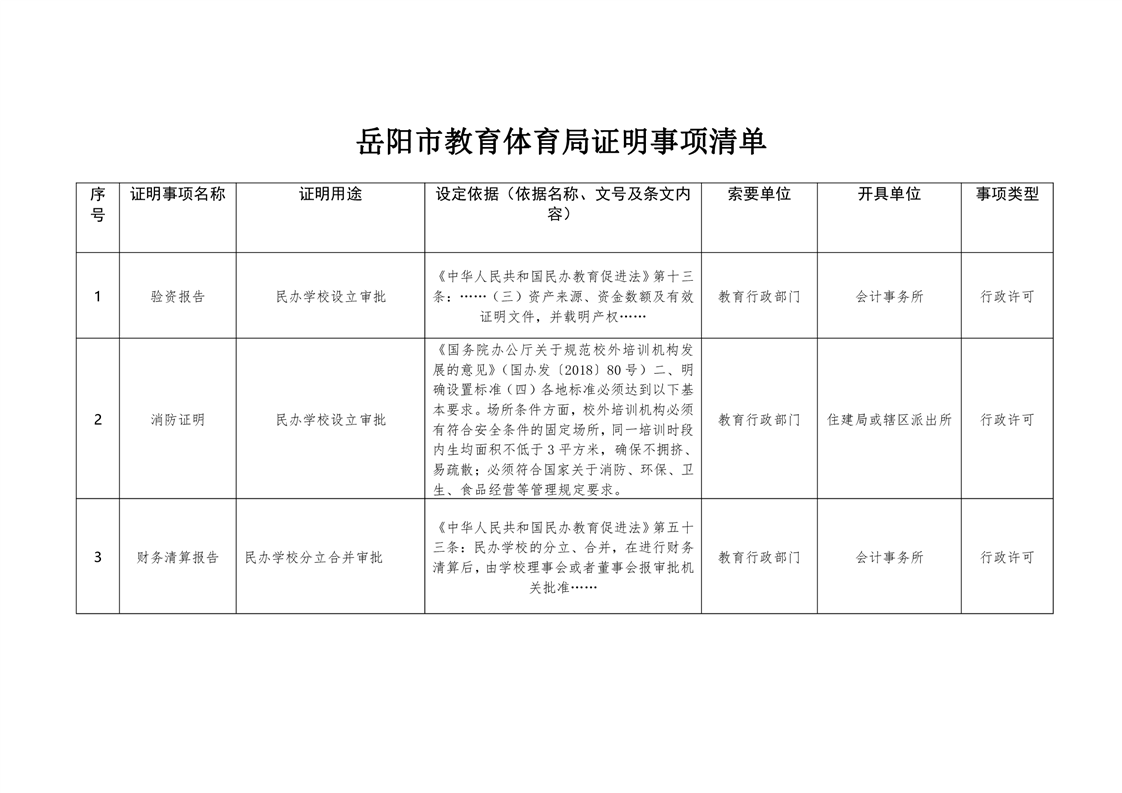 岳阳市教育体育局证明事项清单