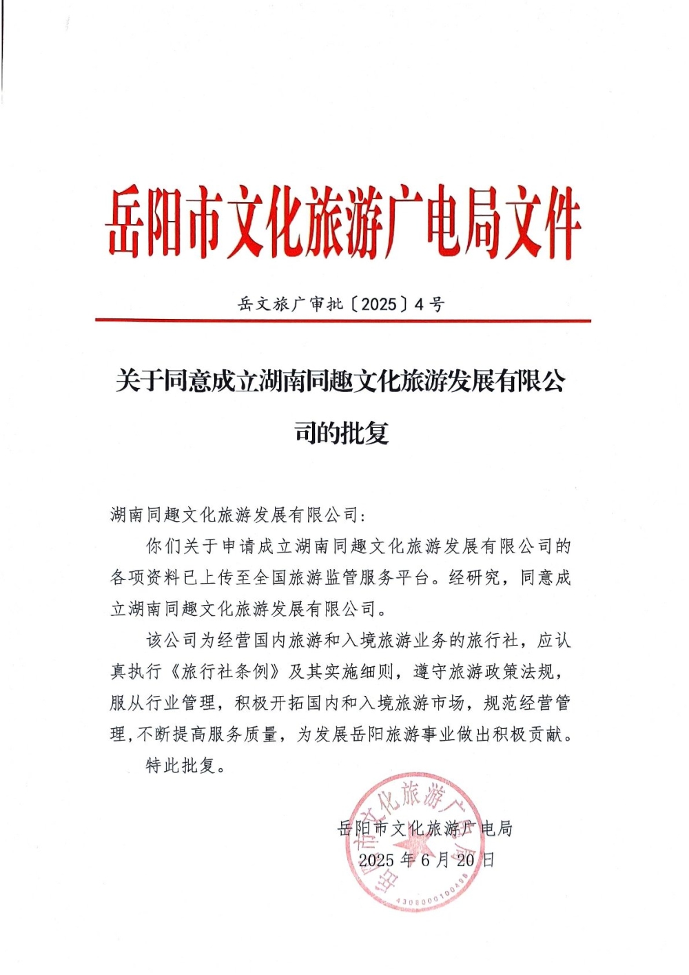 关于同意成立湖南同趣文化旅游发展有限公司的批复