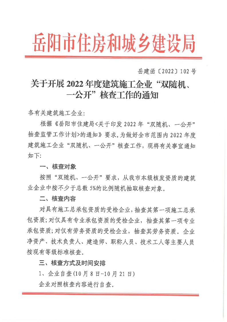 关于开展2022年度建筑施工企业“双随机、一公开”核查工作的通知