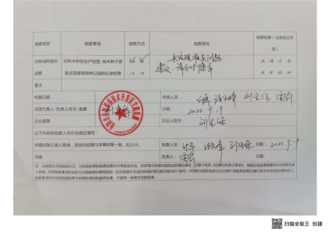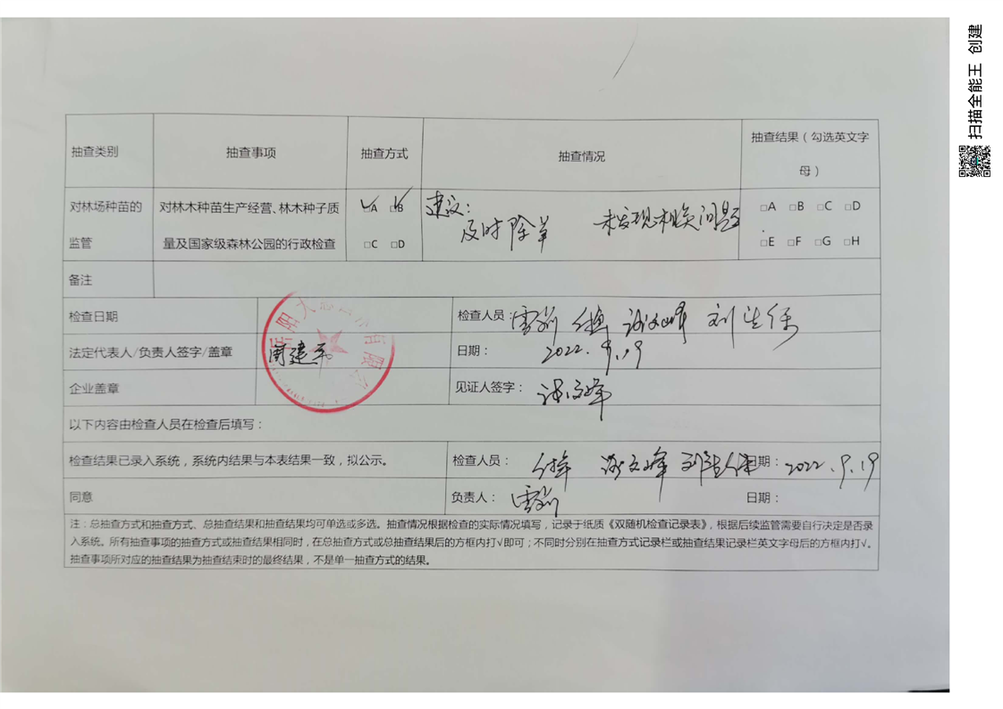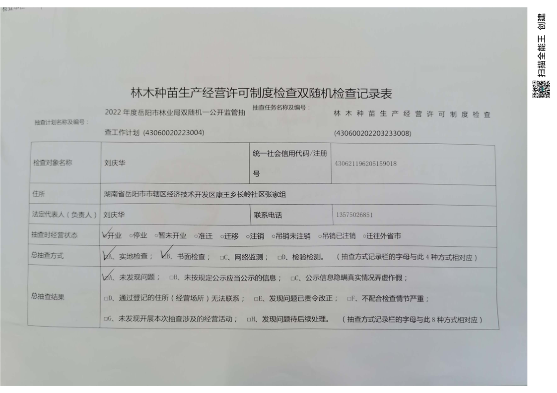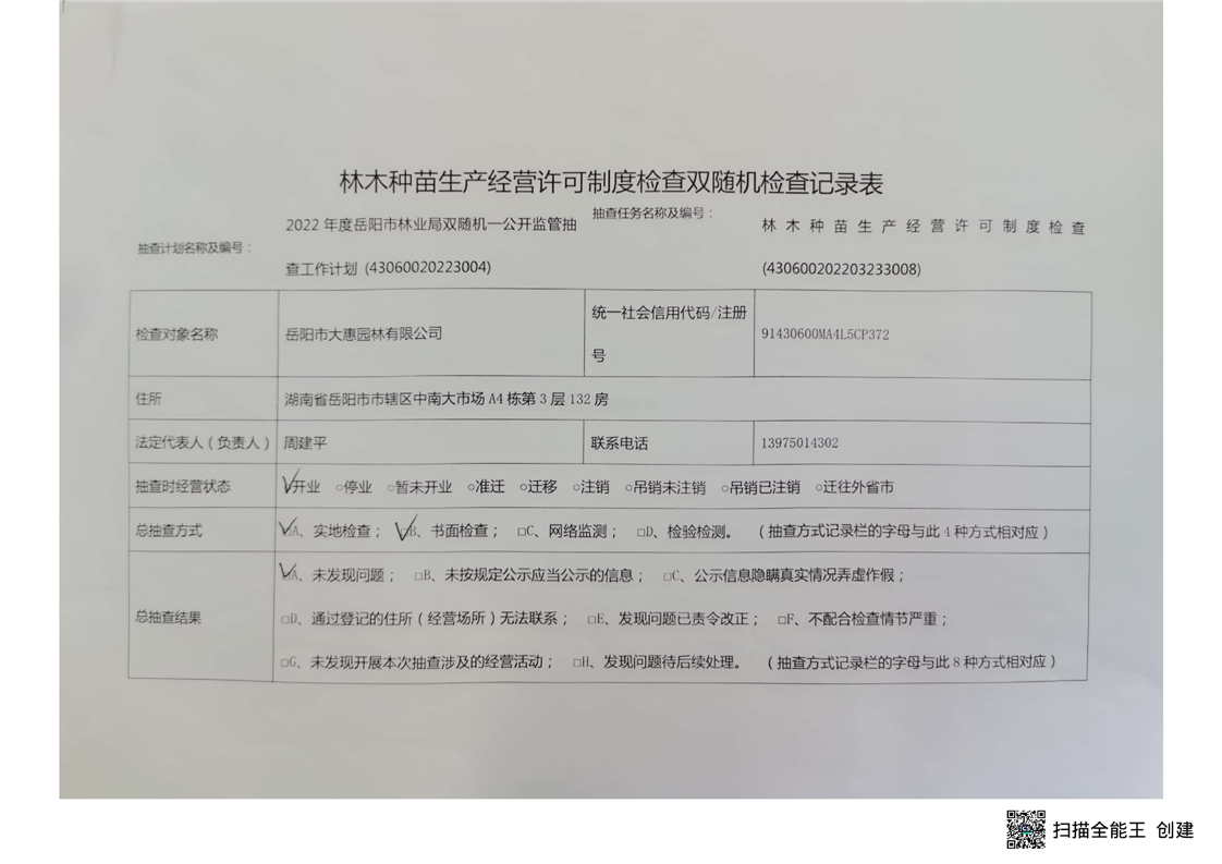 2022年岳阳市林业局林木种苗生产经营许可制度双随机检查结果记录表