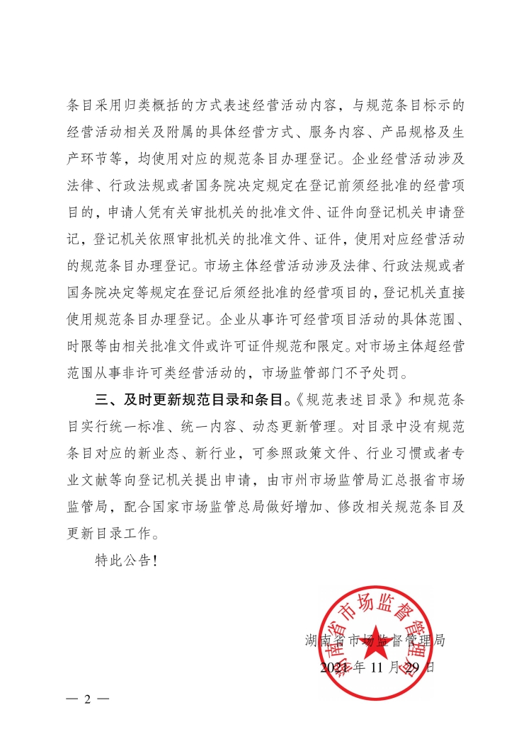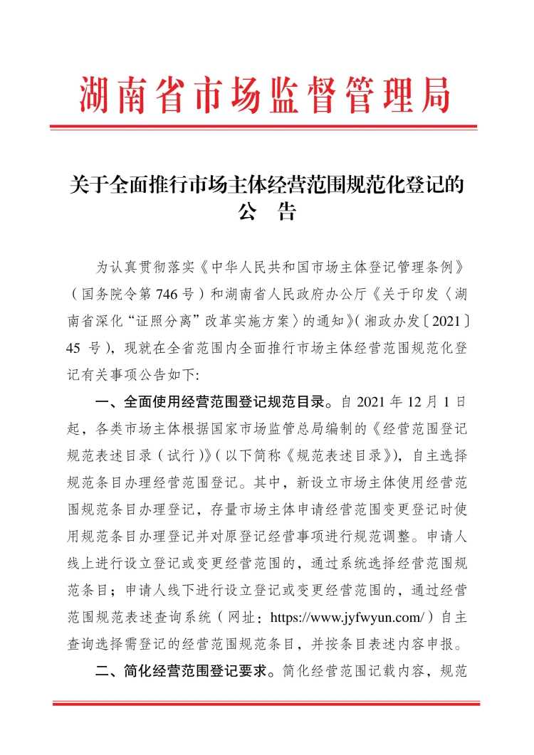 湖南省市场监督管理局关于全面推行市场主体经营范围规范化登记的公告