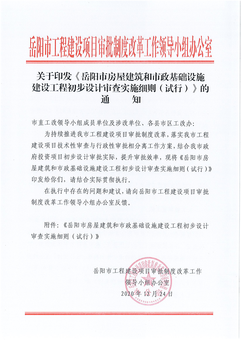 岳阳市工改办关于印发《岳阳市房屋建筑和市政基础设施建设工程初步设计审查实施细则(试行)的通知