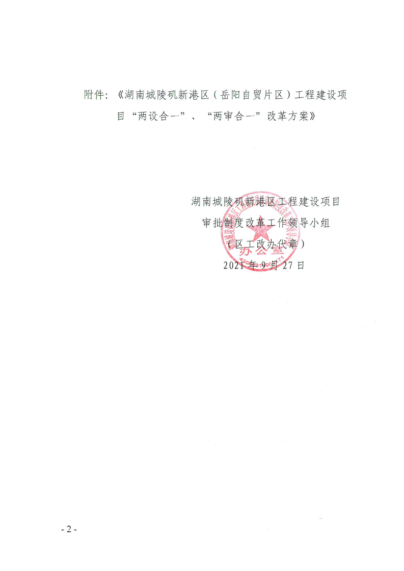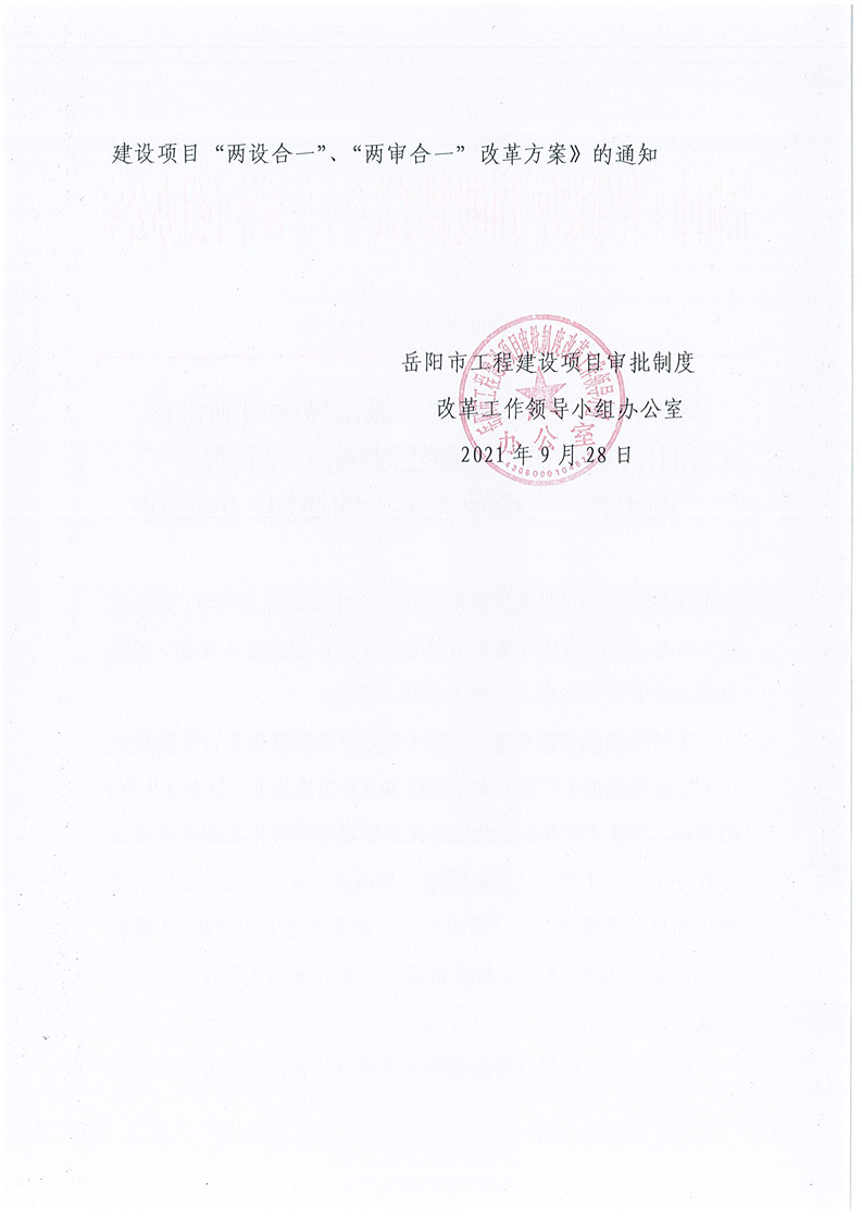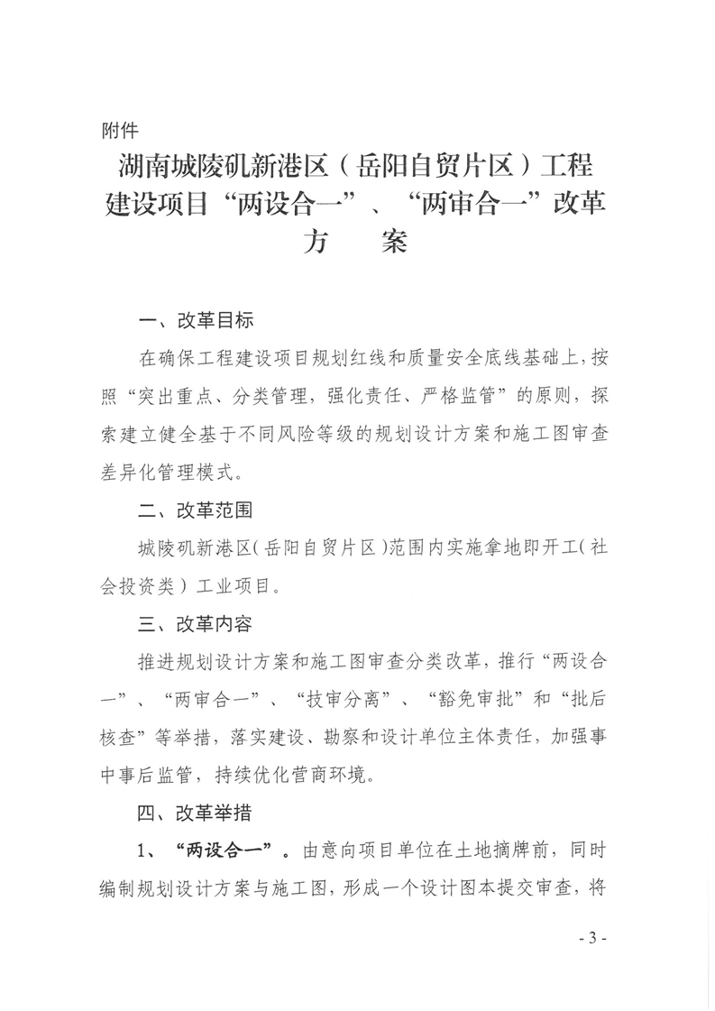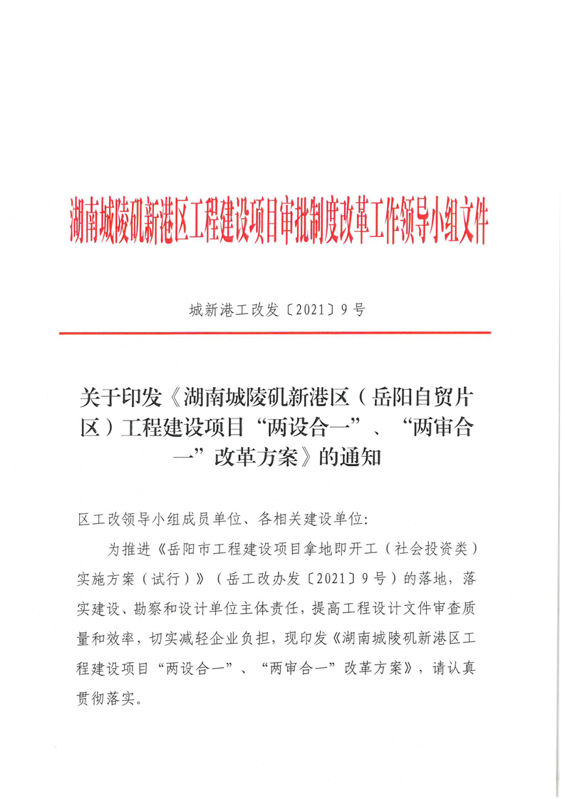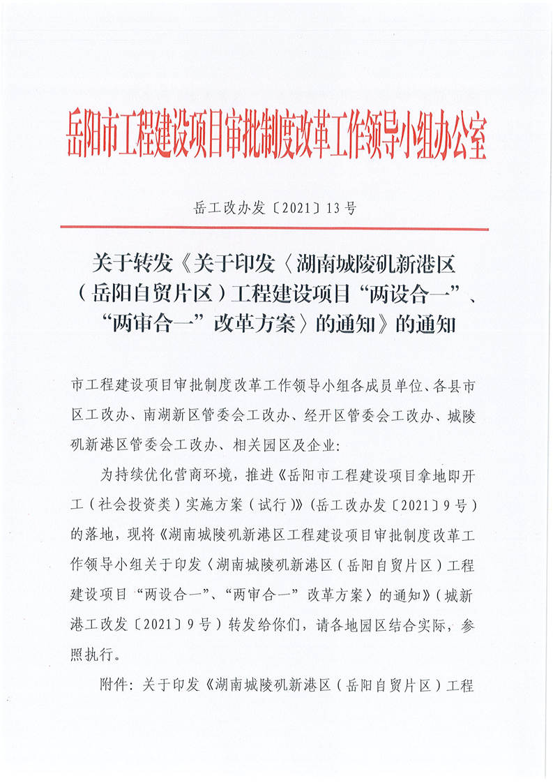 岳阳市工改办关于转发《关于印发〈湖南城陵矶新港区(岳阳自贸片区)工程建设项目“两设合一”、“两审合一”改革方案〉的通知》的通知