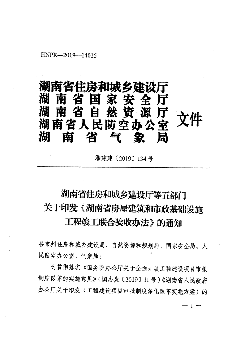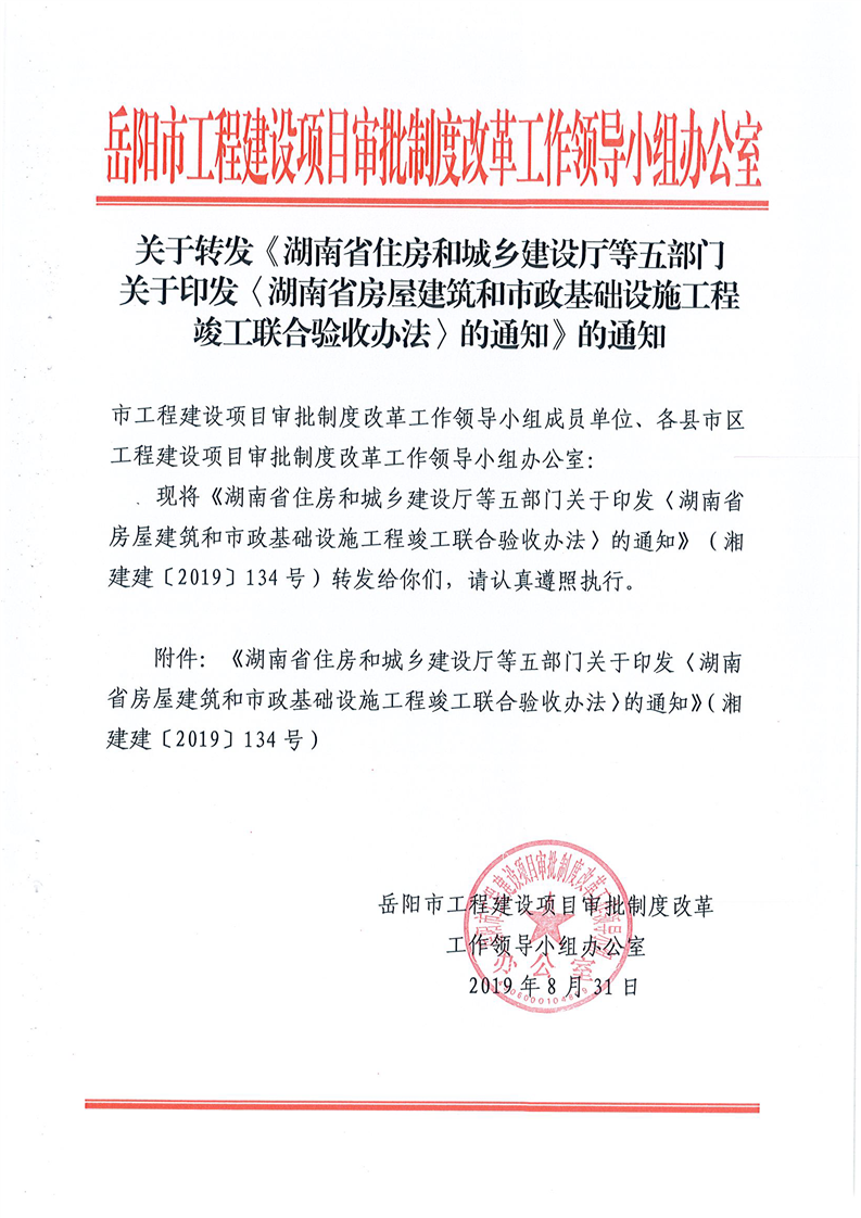 岳阳市工改办关于转发《湖南省住建厅等五部门关于印发〈湖南省房屋建筑和市政基础设施工程竣工联合验收办法的通知〉》的通知