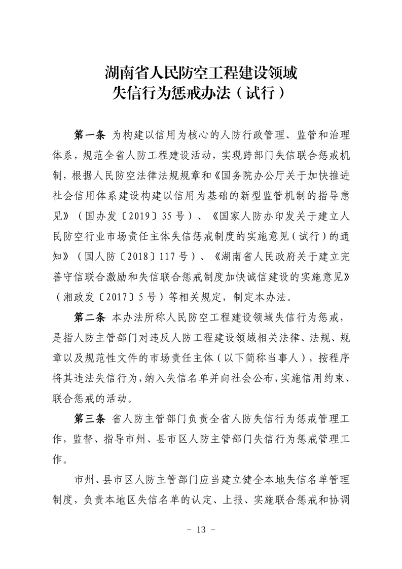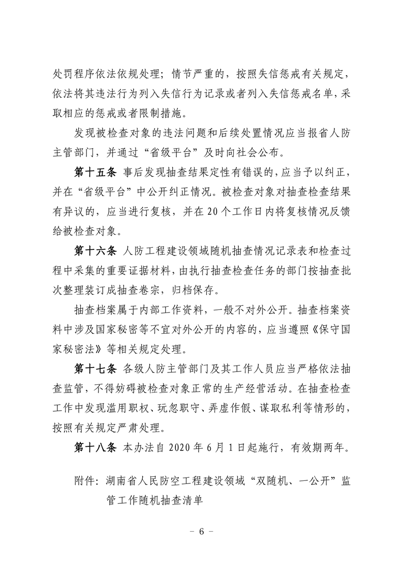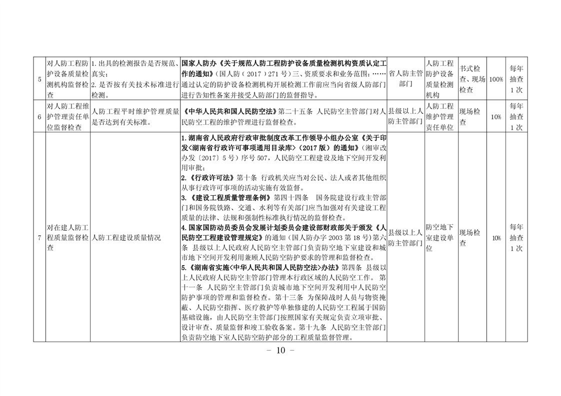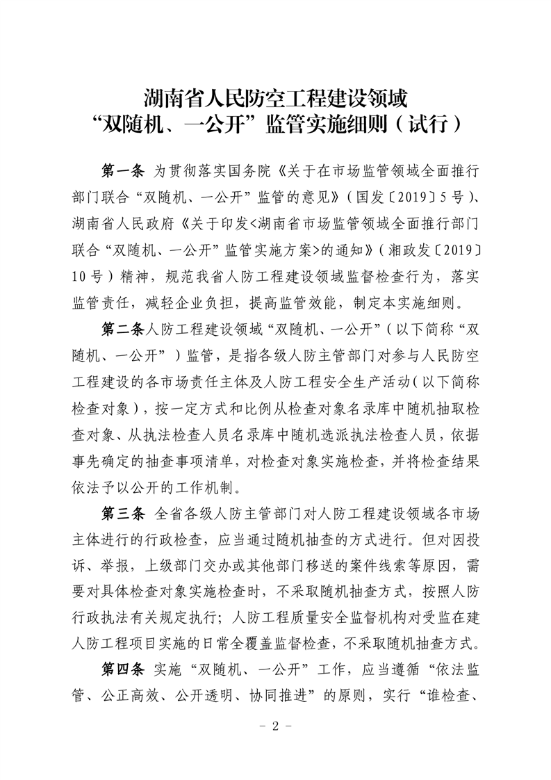 湖南省人民防空办公室关于印发《湖南省人民防空工程建设领域“双随机、一公开”监管实施细则(试行)》《湖南省人民防空工程建设领域失信行为惩戒办法(试行)》的通知