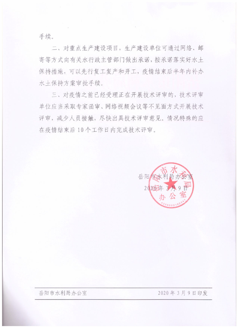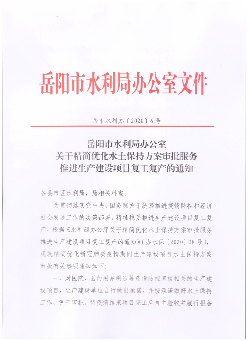 岳阳市水利局办公室《关于精简优化水土保持方案审批服务推进生产建设项目复工复产》的通知