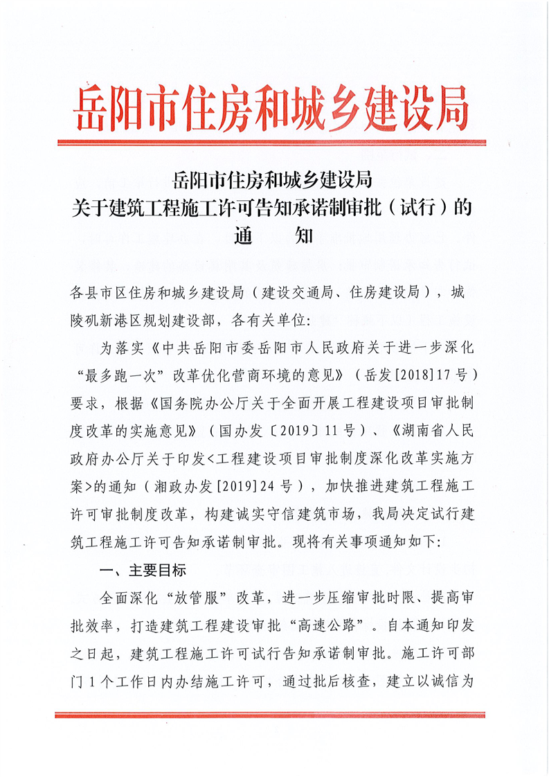 岳阳市住房和城乡建设局《关于建筑工程施工许可告知承诺制审批(试行)的通知》
