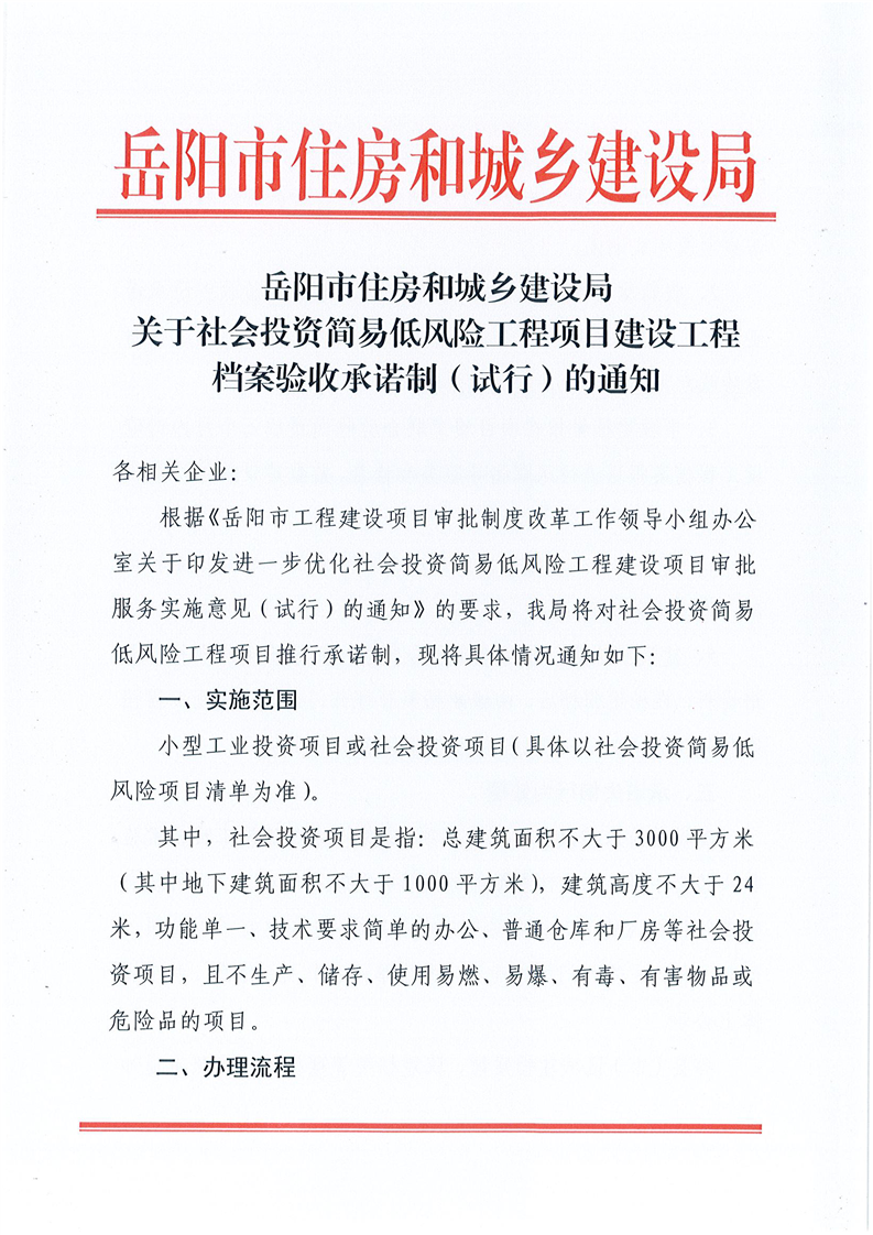 岳阳市住房和城乡建设局《关于社会投资简易低风险工程项目建设工程档案验收承诺制(试行)》的通知