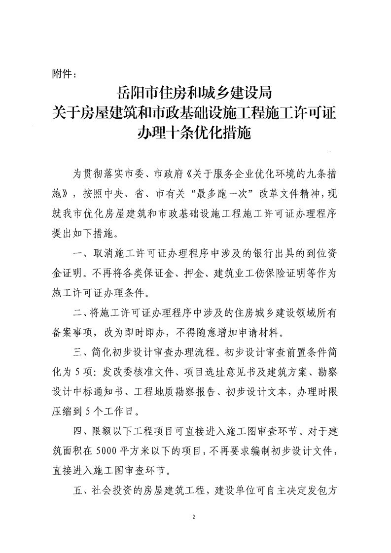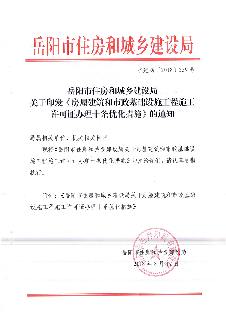 岳阳市住房和城乡建设局关于印发《房屋建筑和市政基础设施工程施工许可证办理十条优化措施》的通知