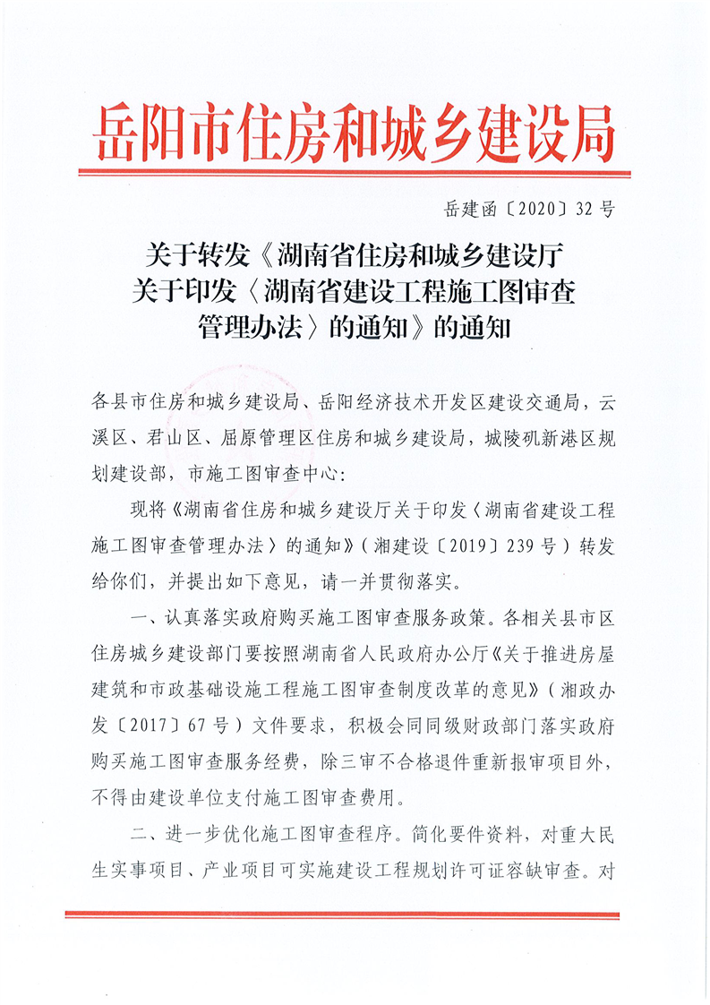 岳阳市住房和城乡建设局关于转发《湖南省住房和城乡建设厅关于印发湖南省建筑工程施工图审查管理办法的通知》的通知
