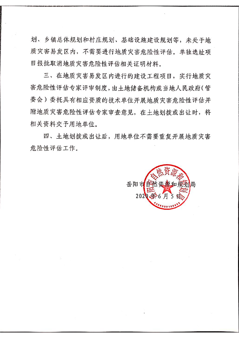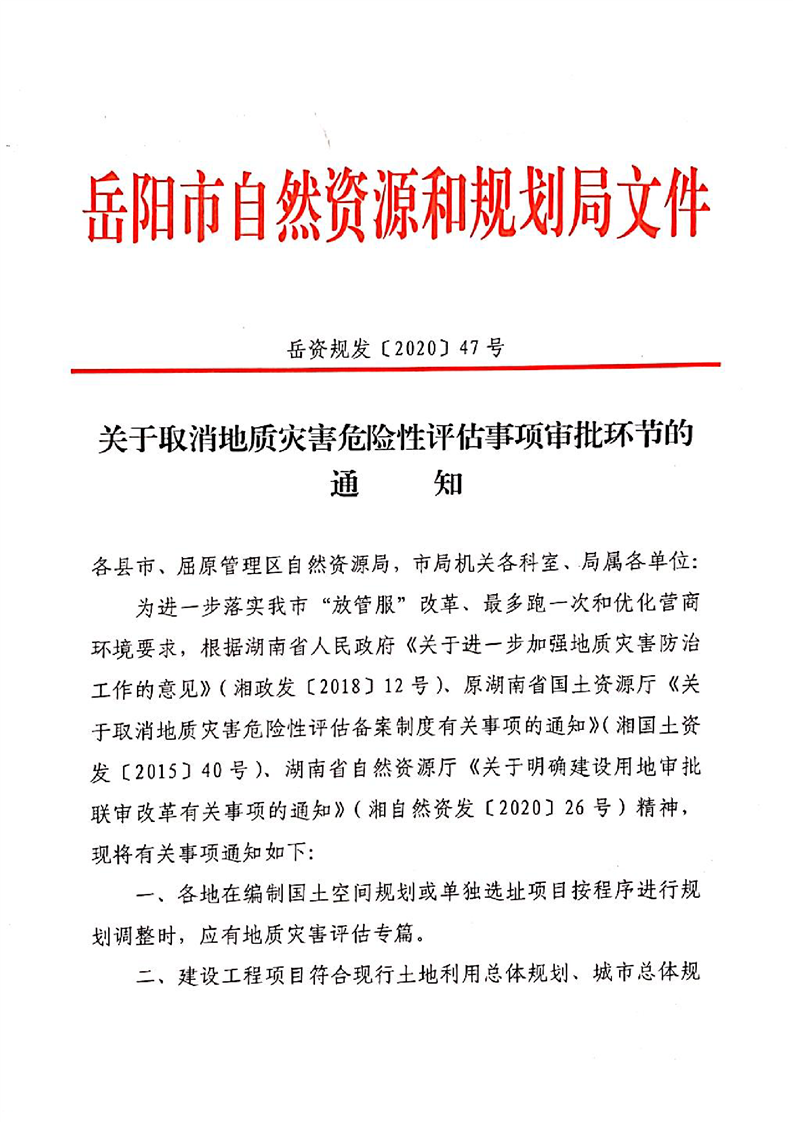 岳阳市自然资源和规划局《关于取消地质灾害危险性评估事项审批环节》的通知