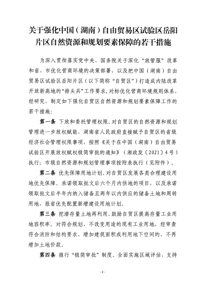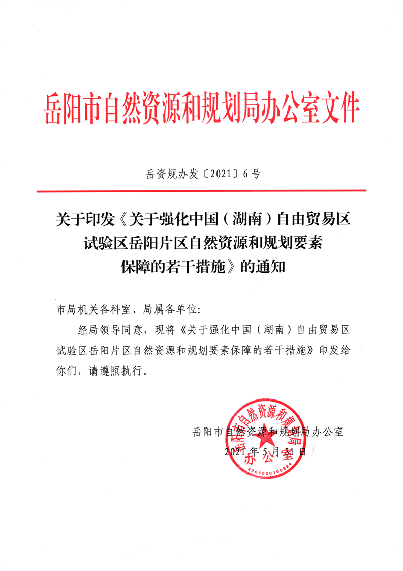 岳阳市自然资源和规划局关于印发《关于强化中国(湖南)自由贸易区试验区岳阳片区自然资源和规划要素保障的若干措施》的通知