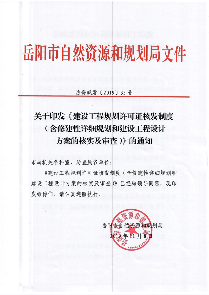 岳阳市自然资源和规划局关于印发《建设工程规划许可证核发制度(含修建性详细规划和建设工程设计方案的核实及审查)》的通知