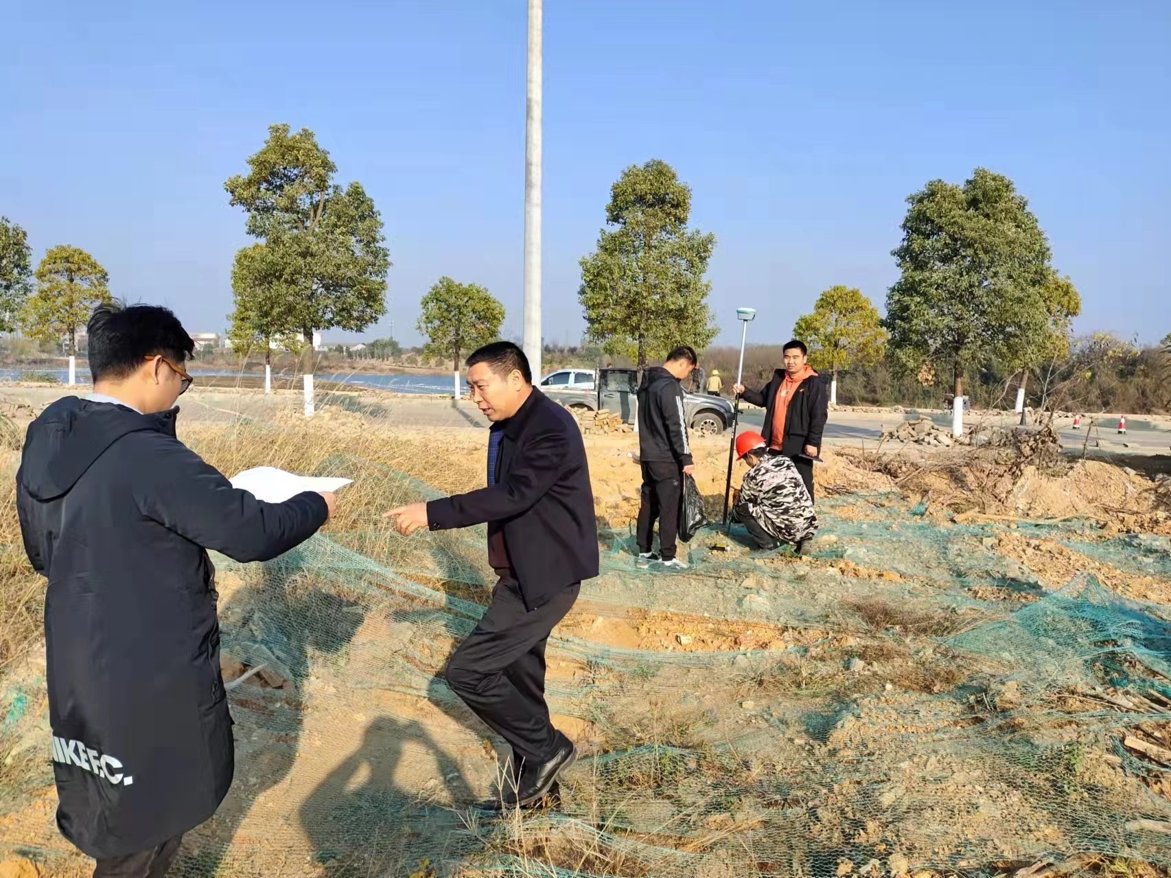 (岳阳市工程审批帮代中心专员深入项目一线,与测绘单位进行施工现场测量放线,送服务上门。)