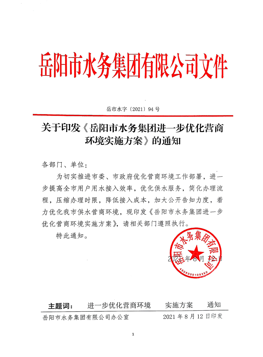 关于印发《岳阳市水务集团进一步优化营商环境实施方案》的通知