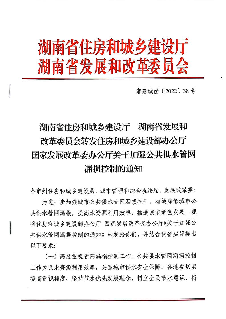 转发住房和城乡建设部办公厅国家发展改革委办公厅《关于加强公共供水管网漏损控制》的通知