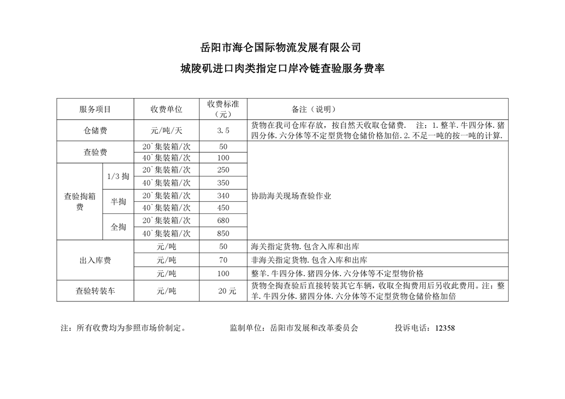 城陵矶进口肉类指定口岸冷链查验服务费率公示