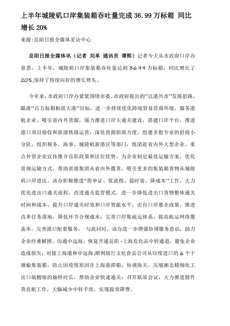 上半年城陵矶口岸集装箱吞吐量完成36.99万标箱 同比增长20%
