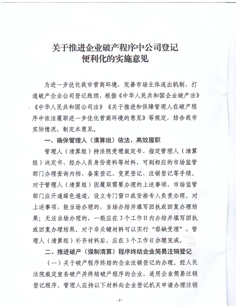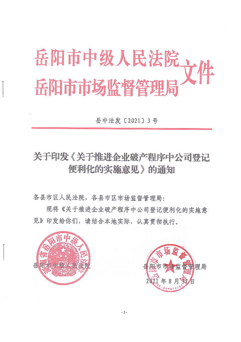 岳阳市中级人民法院、岳阳市市场监督管理局关于印发《关于推进企业破产程序中公司登记便利化的实施意见》的通知