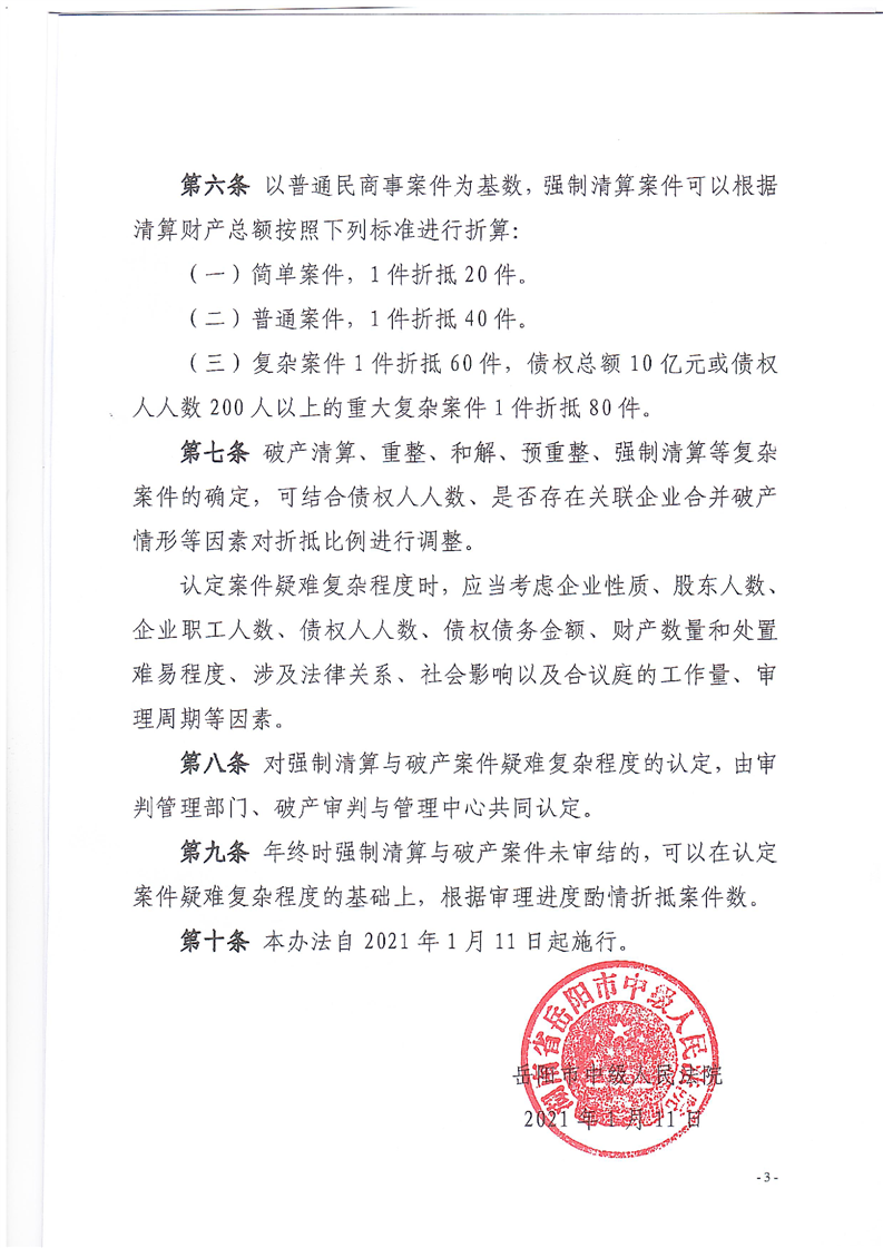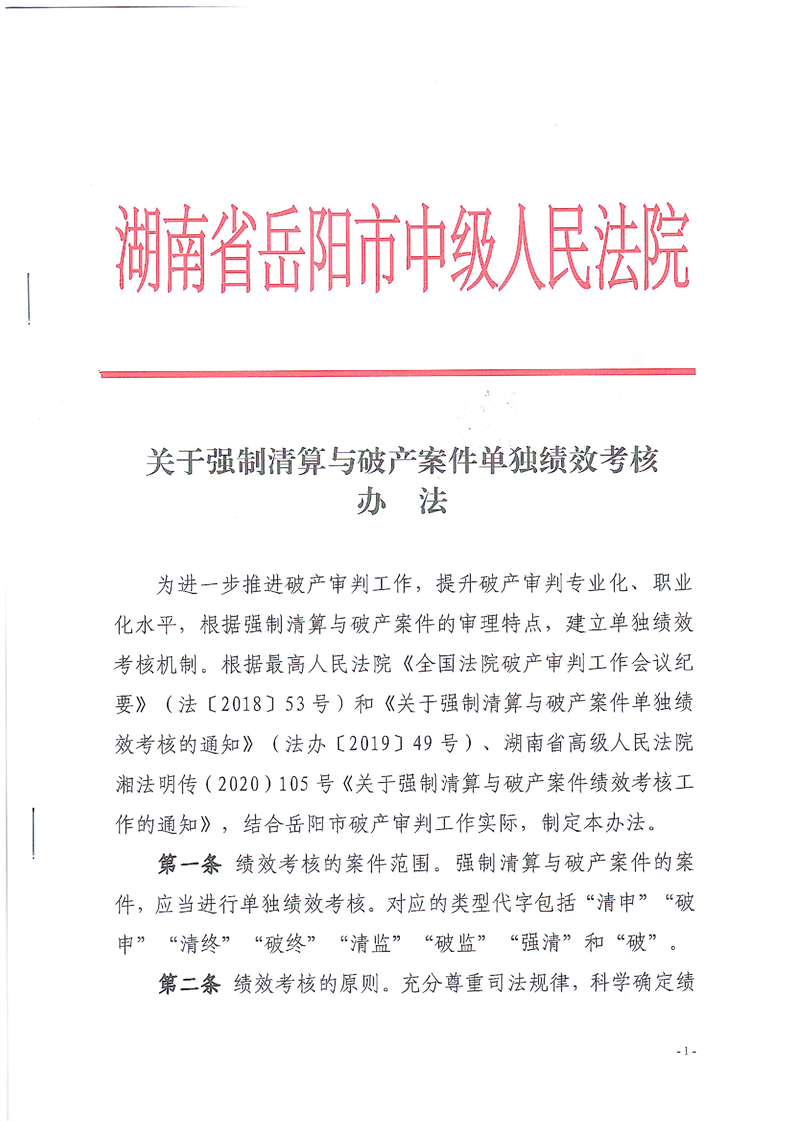岳阳市中级人民法院关于强制清算与破产案件单独绩效考核办法