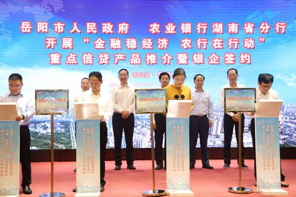 11月9日,由岳阳市政府金融办牵头,农行湖南省分行“金融稳经济农行在行动”重点信贷产品推介暨银企签约活动在岳举办。省农行相关负责人、各县市区和市直有关单位主要负责人等参加活动,岳阳市委副书记、市长李挚出席。