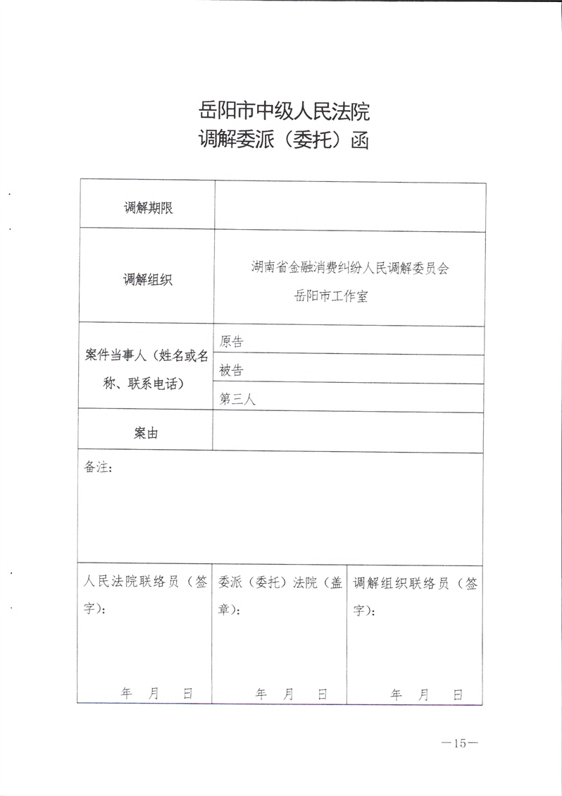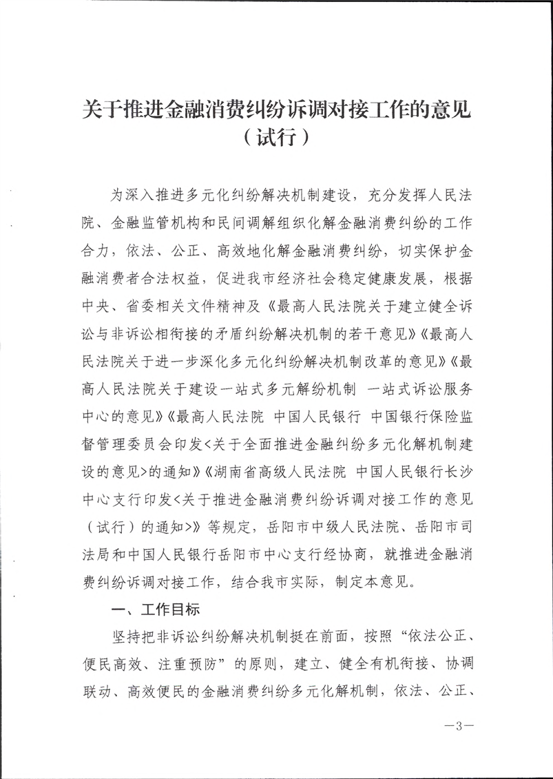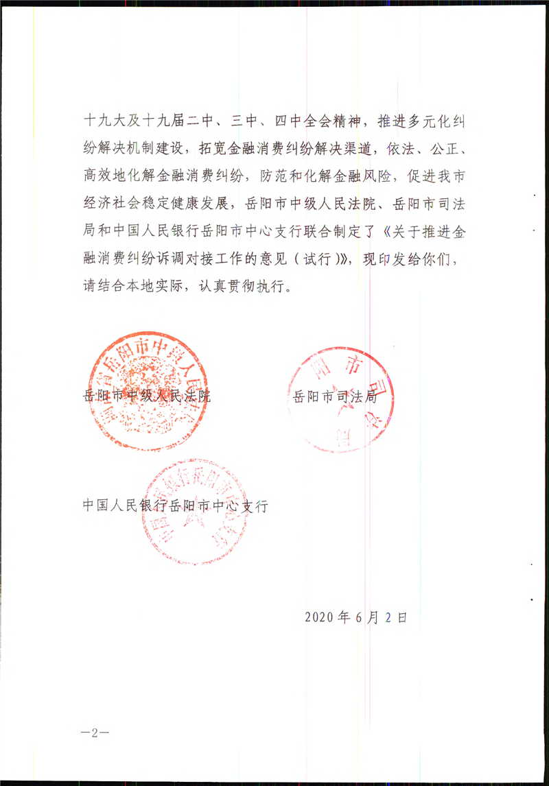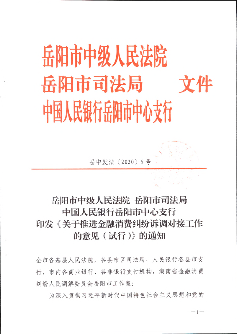 岳阳市中级人民法院、岳阳市司法局、中国人民银行岳阳市中心支行关于印发《关于推进金融消费纠纷诉调对接工作的意见(试行)》的通知