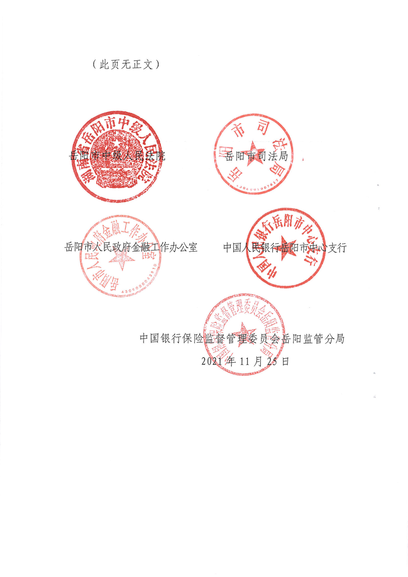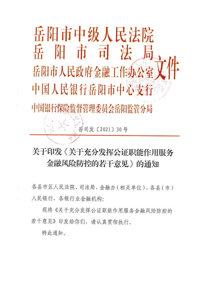 岳阳市中级人民法院、岳阳市司法局、岳阳市政府金融办、中国人民银行岳阳市中心支行、中国银保监会岳阳监管分局关于印发《关于充分发挥公证职能作用服务金融风险防控的若干规定》的通知