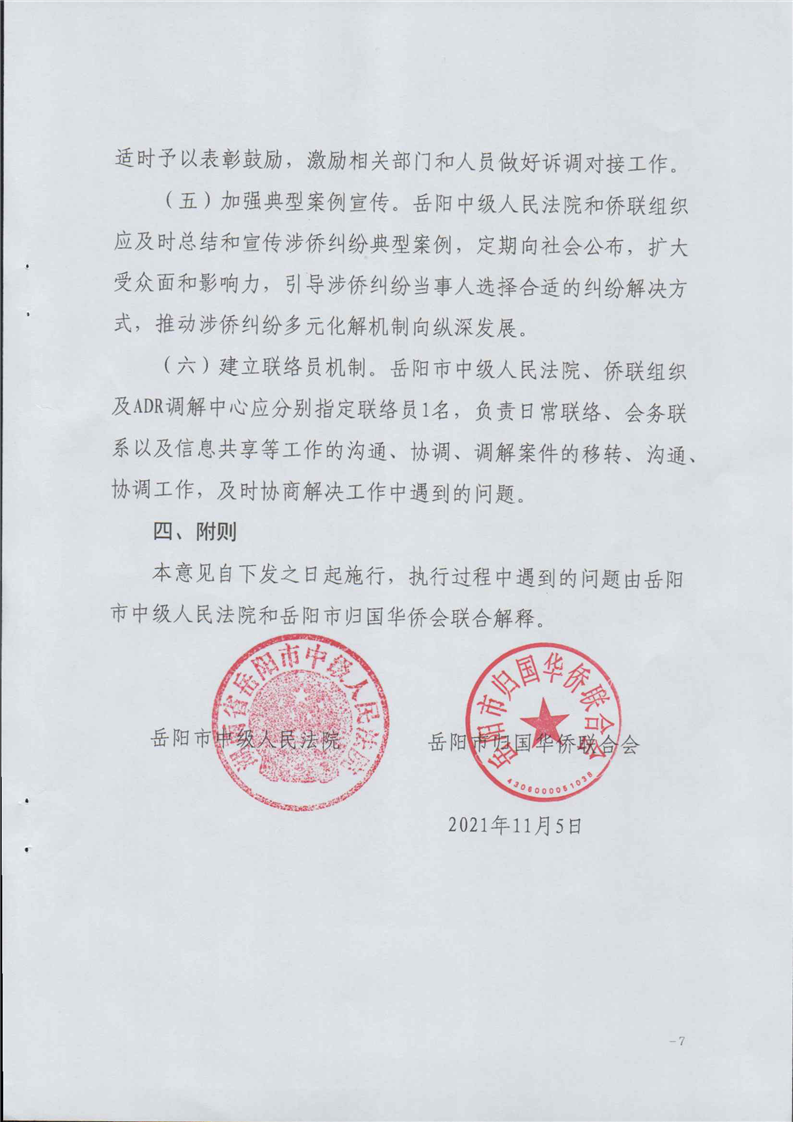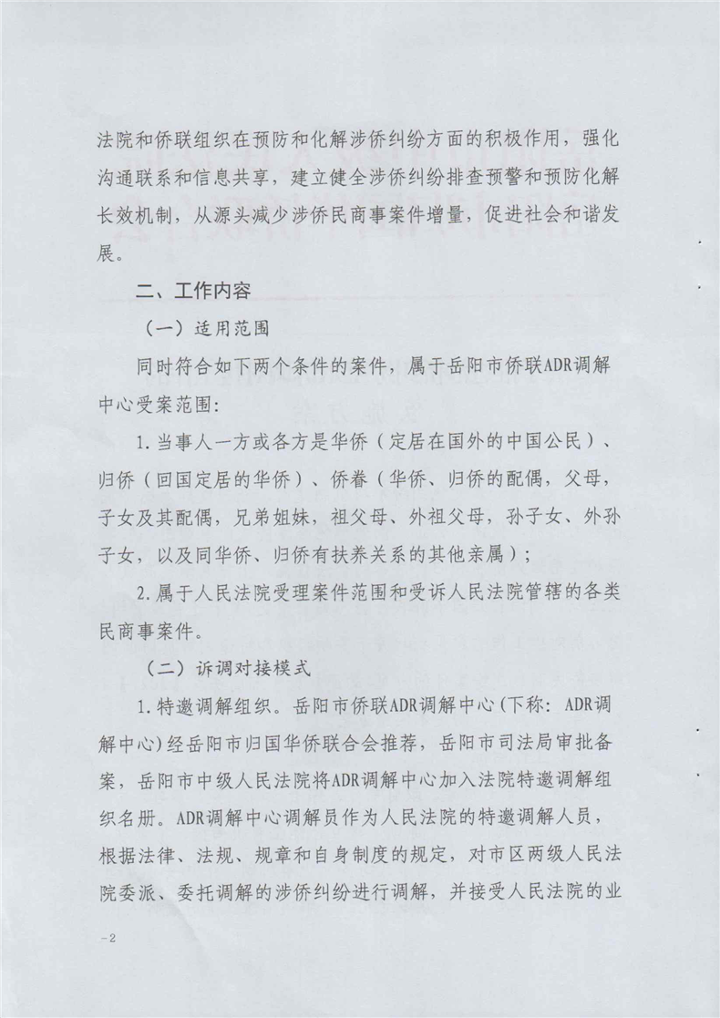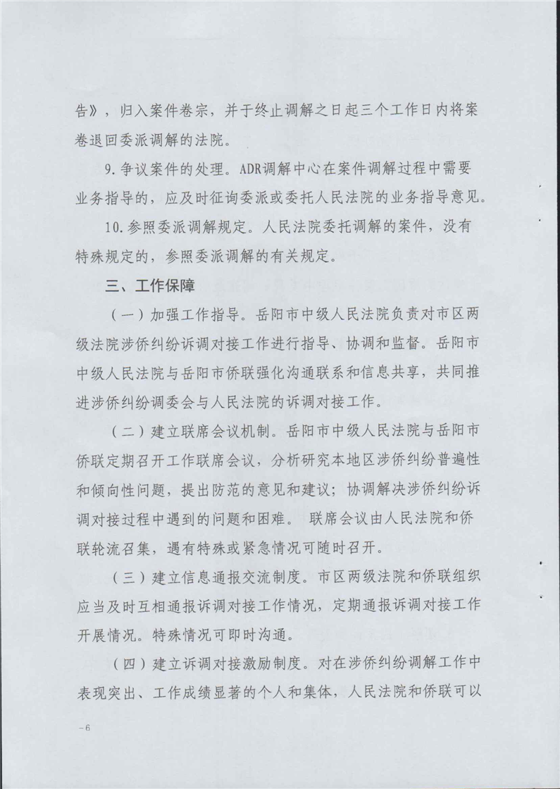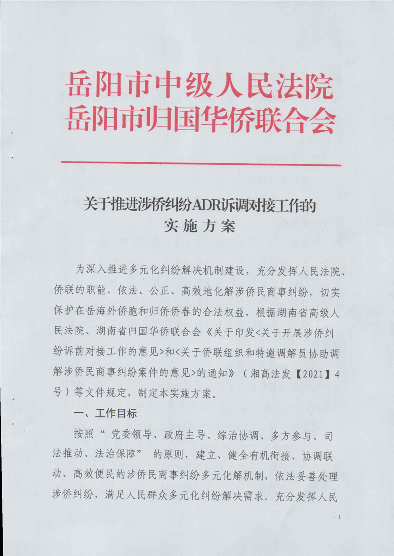 岳阳市中级人民法院、岳阳市归国华侨联合会《关于推进涉侨纠纷ADR诉调对接工作的实施方案》