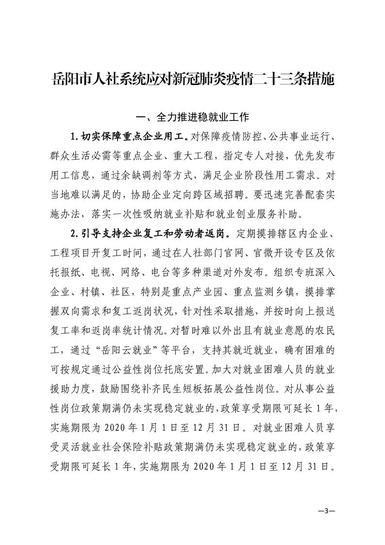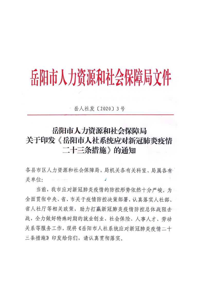 关于印发《岳阳市人社系统应对新冠肺炎疫情二十三条措施》的通知