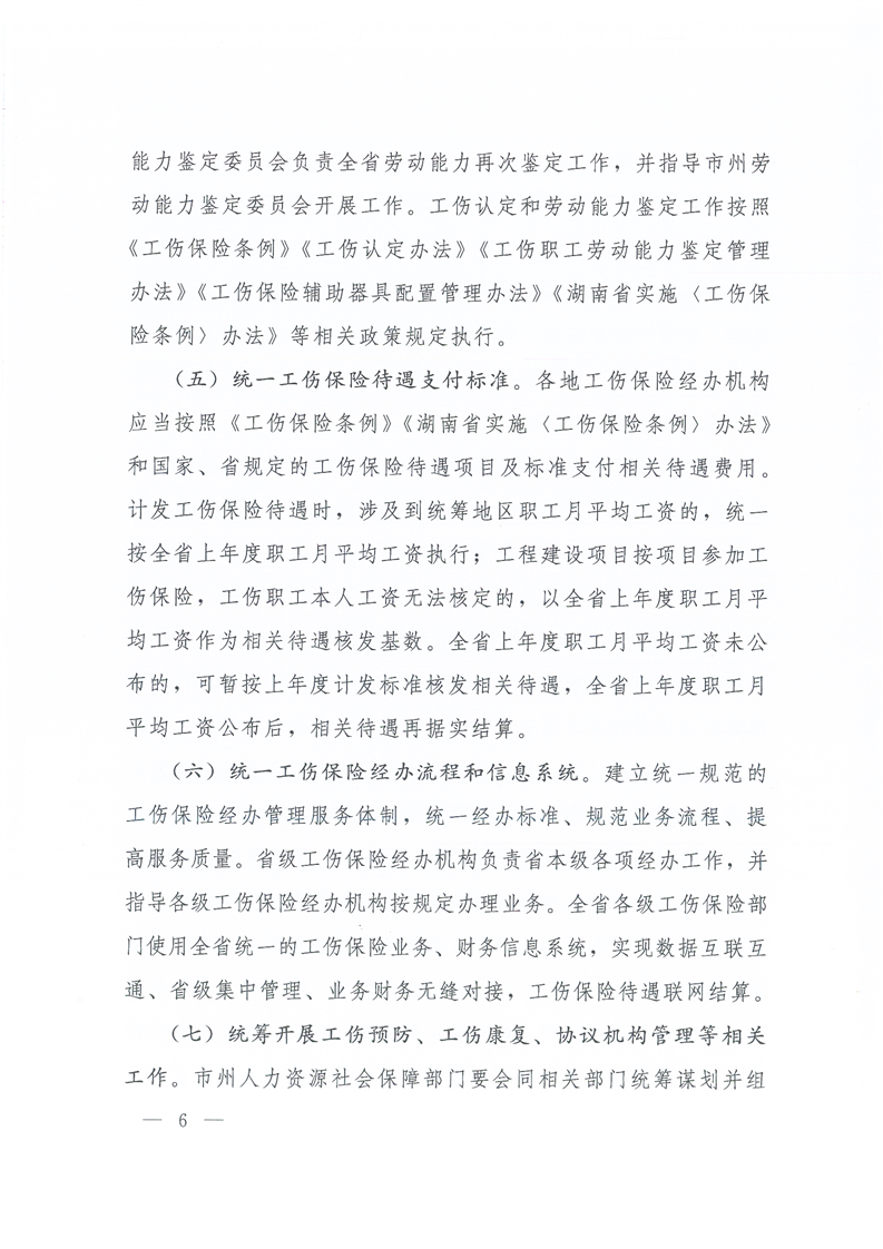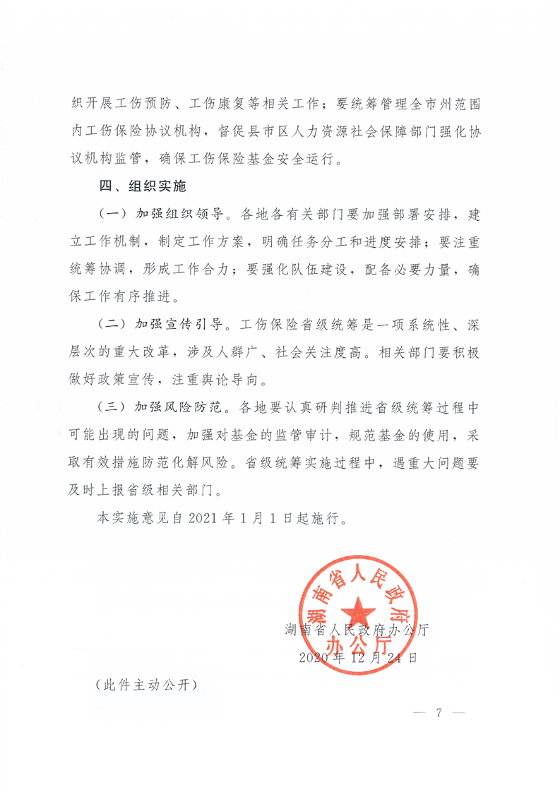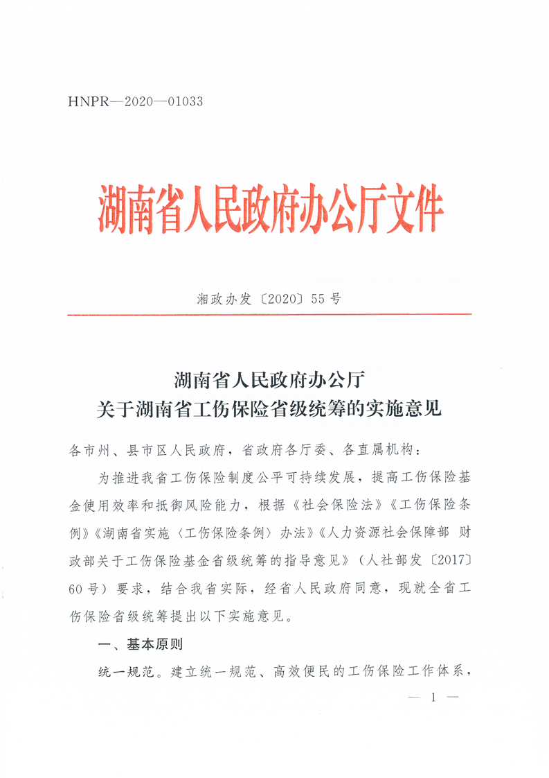 湖南省人民政府办公厅关于湖南省工伤保险省级统筹的实施意见