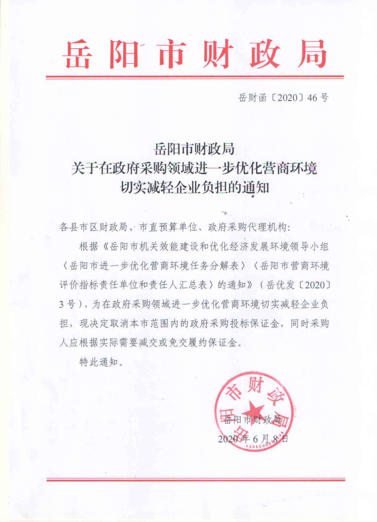 岳阳市财政局关于在政府采购领域进一步优化营商环境切实减轻企业负担的通知岳财函〔2020〕46号