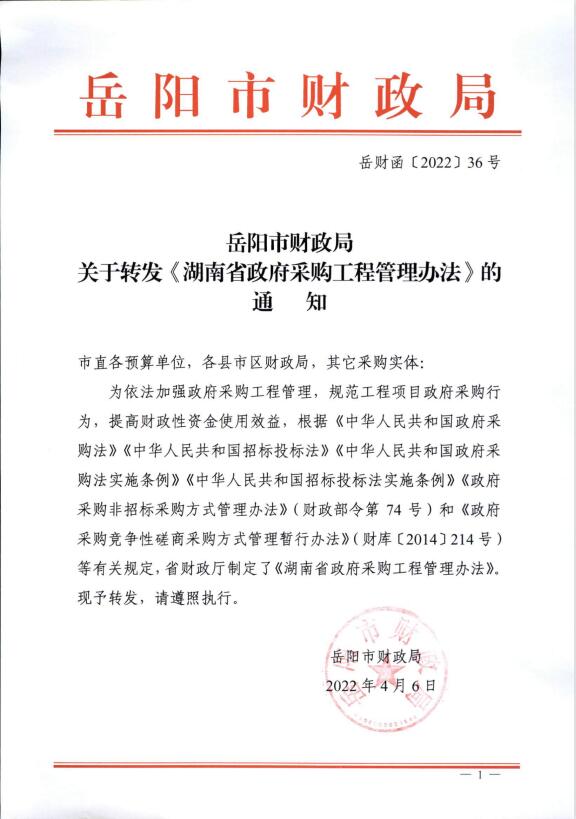 岳阳市财政局关于转发《湖南省政府采购工程管理办法》的通知-岳财函〔2022〕36号